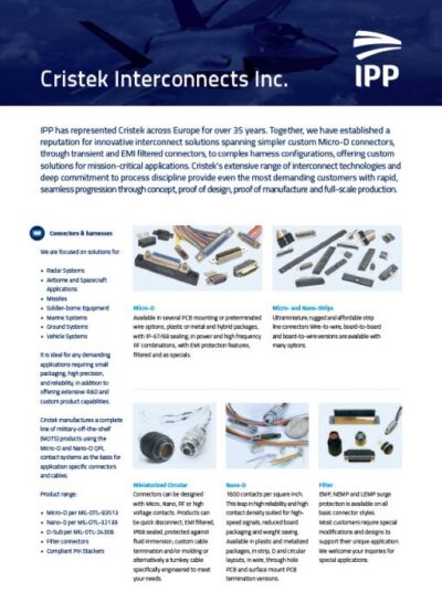 IPP has represented Cristek across Europe for over 25 years. Together, we have established a reputation for innovative interconnect solutions spanning simpler custom Micro-D connectors, through transient and EMI filtered connectors to full and complex combination harness configurations.